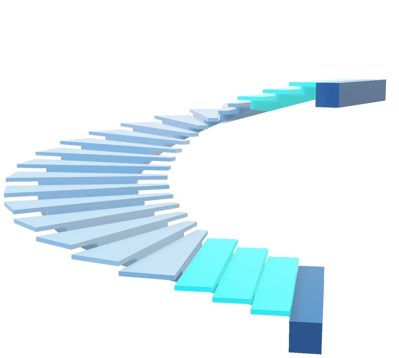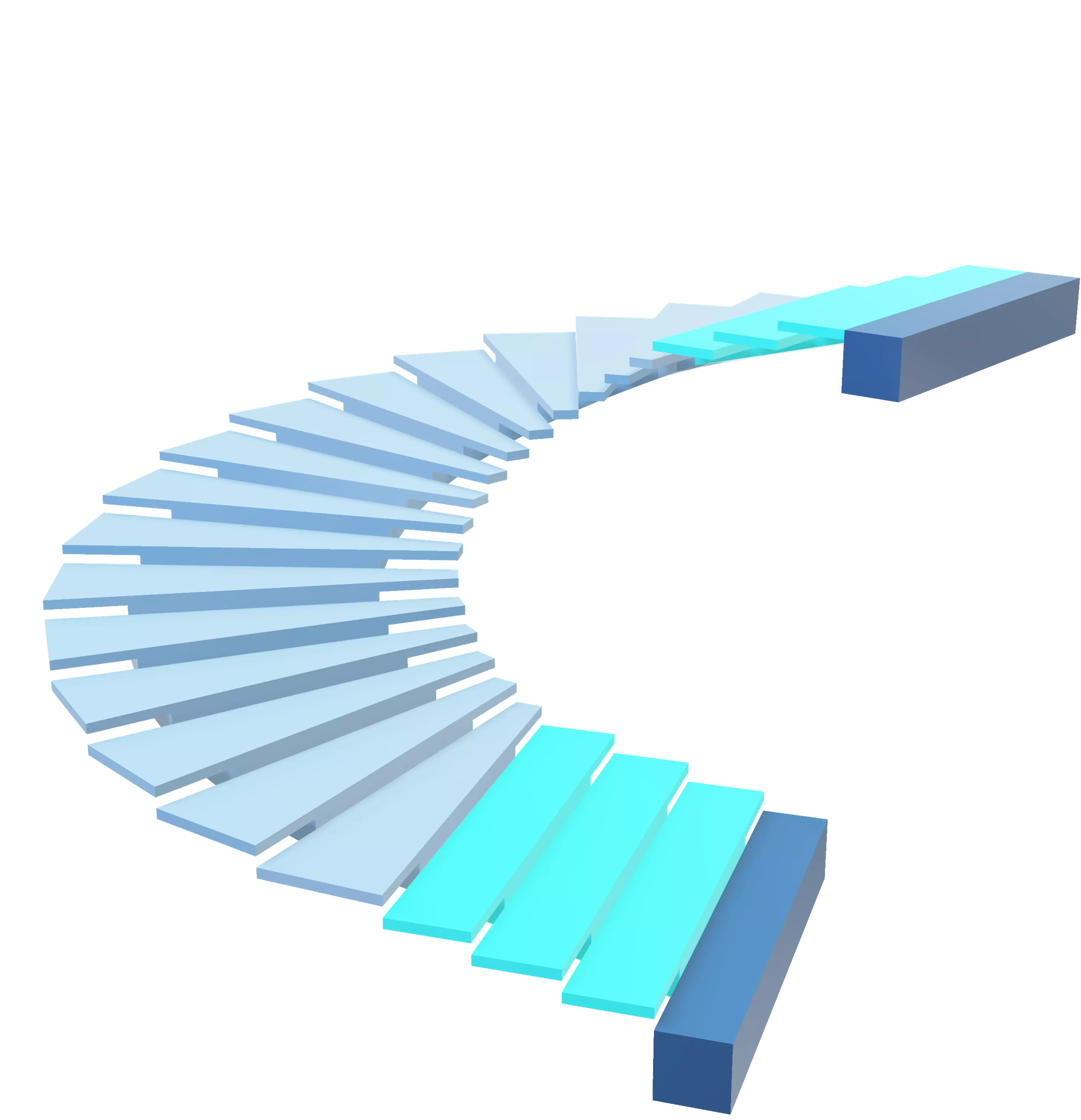 Escada helicoidal com 2 trechos retos, degraus parcialmente em balanço e mais de 3 m de largura do lance.