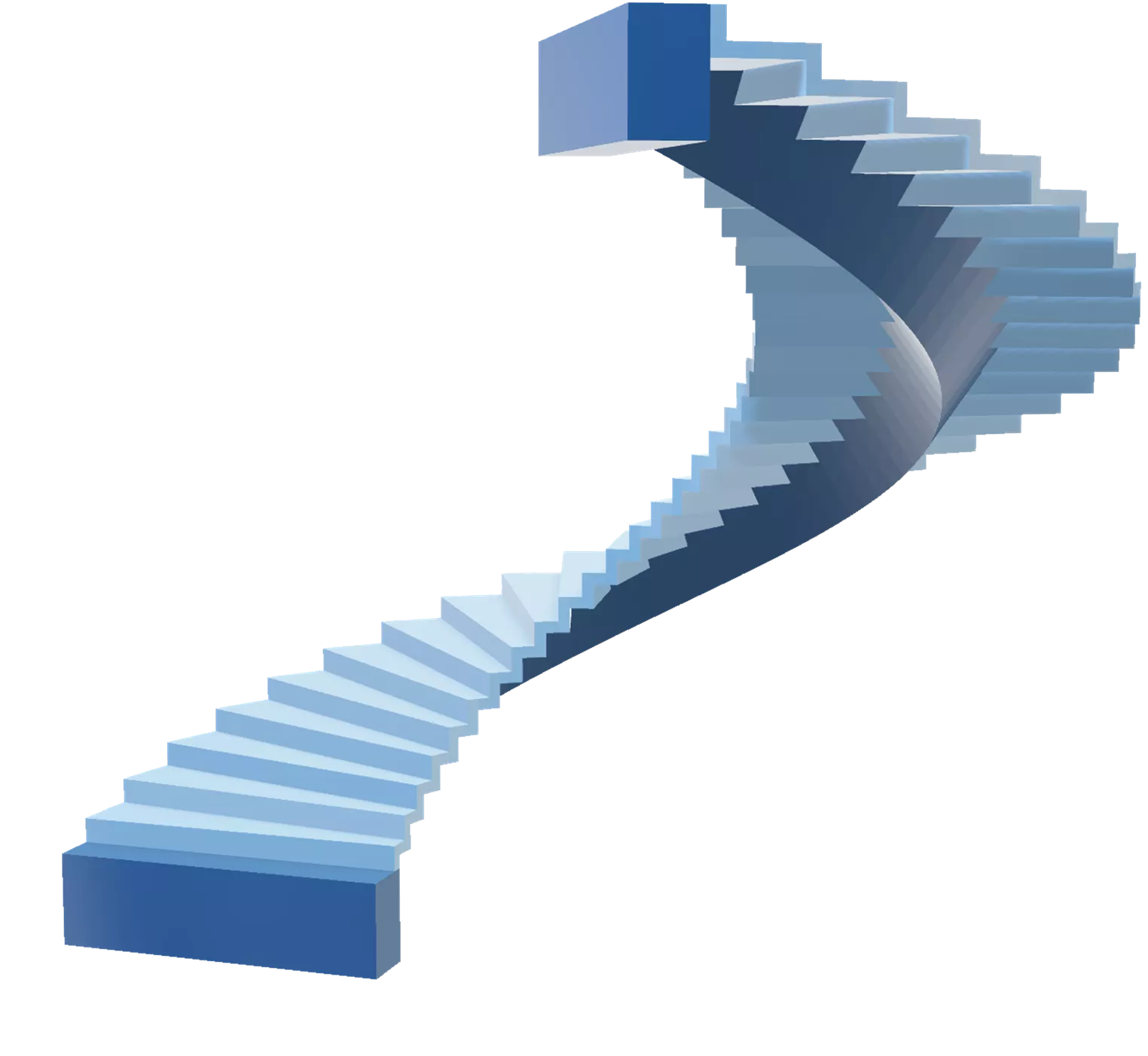 Escada helicoidal com degraus plissados apoiada em uma viga central de seção triangular.